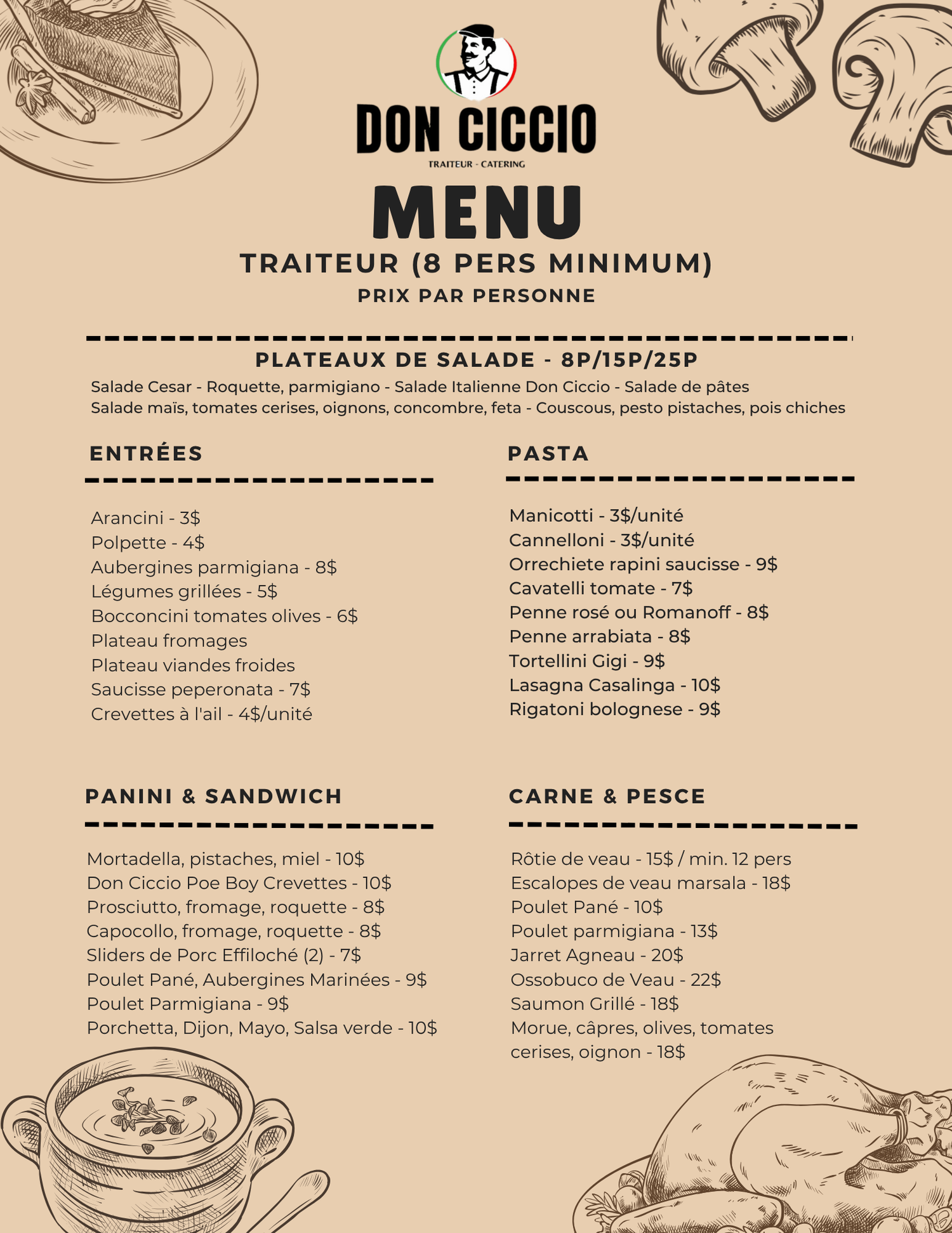 Vous reçevez à la maison, au bureau ou planifiez un événement? Combinez des items ci-bas pour créer votre menu! Vous cherchez à avoir un menu plus rafiné? Pas de problèmes non plus! Contactez notre équipe pour avoir un menu personalisé ou menu bouchées découverte!